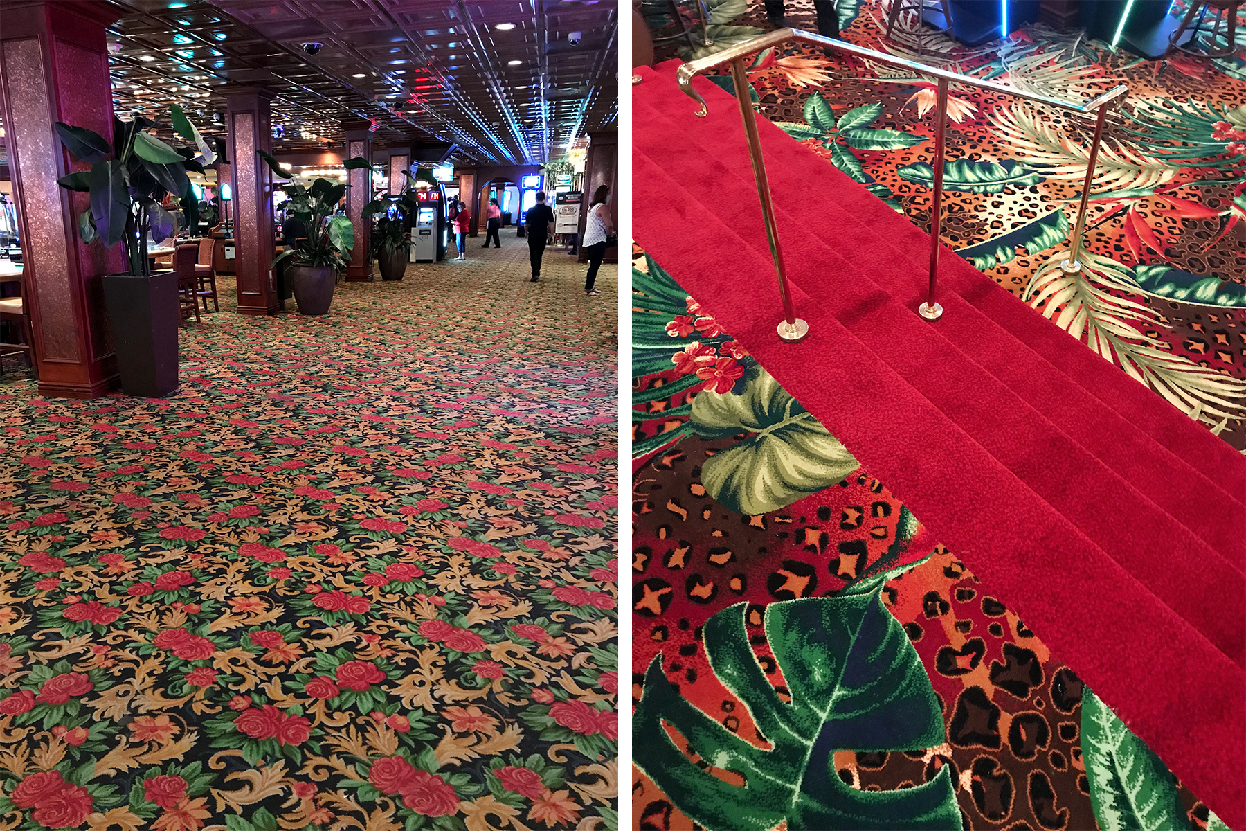 Ryals’ rugs replicate pretend replicas — the carpets we see in Las Vegas casinos are not highly expensive rugs, nor are they based on beauty. Instead, busy and maze-like patterns are designed to make visitors confused walking around the casinos— if you’ve ever been in a Las Vegas casino, you could be in there for 12, 24, or even 48 hours and not even realize what time it is outside. The carpets themselves try to confuse you, and the setup of the gambling tables and slots adds to the feeling of disorientation. There’s extra constructed chaos to that — people, when they have chips, if they drop them, they generally get lost in the patterns of the carpet, and often they are not picked up, and money and other items are just left on the ground. This is all part of a thought-out manipulation that all of Las Vegas’ casinos are in on; it helps keep people inside, continue to gamble, and not realize how much money they have lost. Next time I visit Vegas I will be considering the carpeting with much more artistic appreciation, and I can’t wait to see what I will discover.