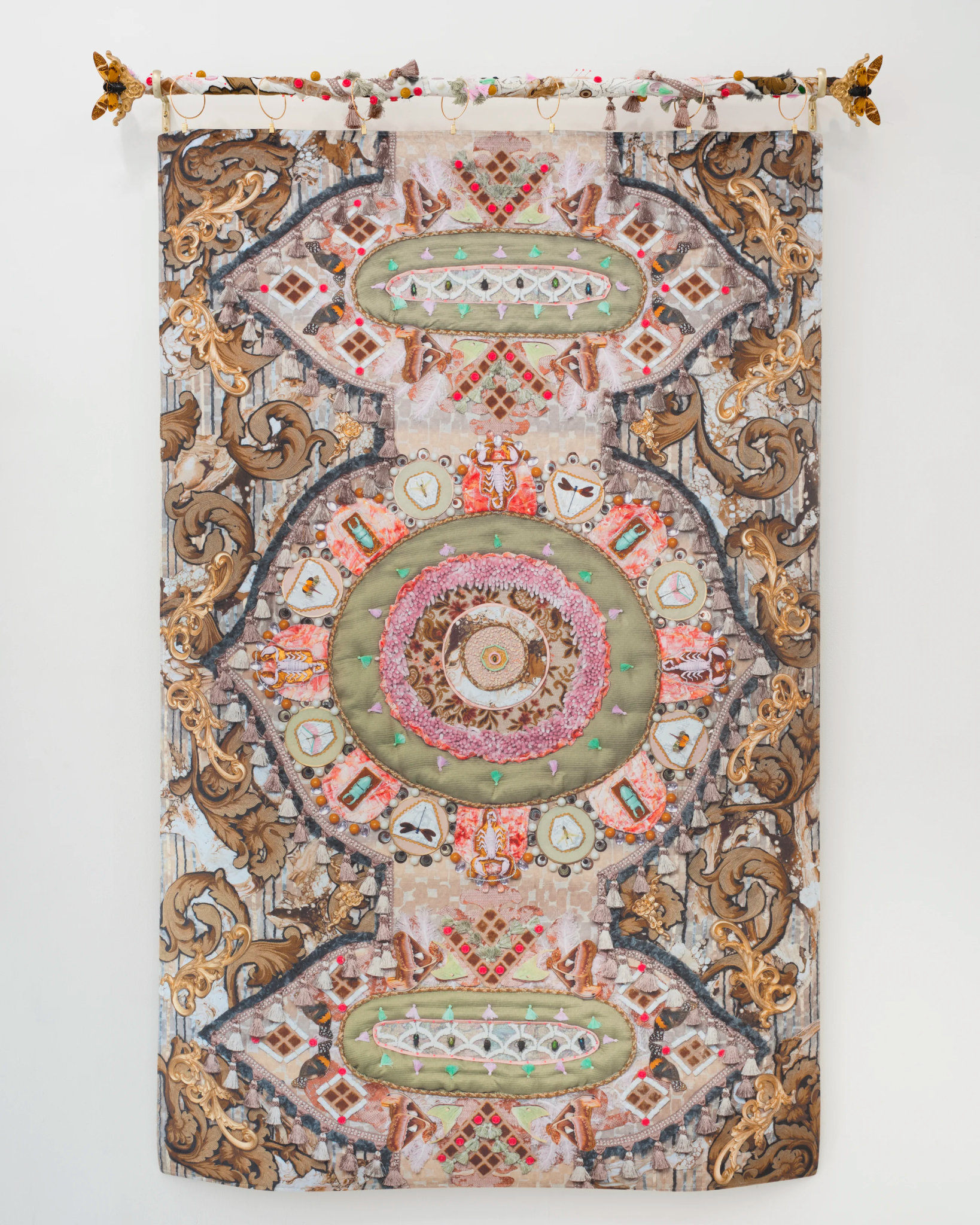 Textile work is notoriously tricky to display. And, when collectors look at it, they wonder: how can I install this in my home? Ryals has not only found a good solution, but her hanging mechanism is part of the integrity of the work. She has clipped her velvet pieces to a curtain rod, paired with gold, gaudy hardware (a nod to Vegas), and, upon closer look, fascinating decorations. The objects on the curtain rods are the same objects featured in the rug that it is holding up. Each decorated curtain rod is unique; they are decorated and made with the materials that you see in the rug’s imagery. I love this element so much — it gives a sense of ‘The Collector’ (or hoarder) mentality that goes into the creation of these pieces, as well as overconsumption.