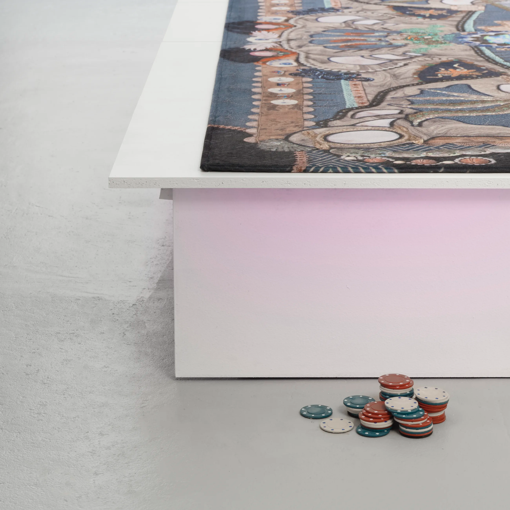 Elements of gambling and lottery culture — poker chips, cards, dice, and used lottery tickets—are in the velvet works and the objects themselves scattered on the floor. Ryals aggressively confronts us with the idea of chasing wealth purely by chance. Combining patterning based on bad design, loosely resembling fancy Persian rugs, Ryals’ works speaks to the mimicry and confusion that casinos have mastered so well.