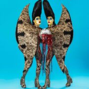 Amid falling notes in jumbles of shining scales, a piano and tickled guitar of a jazz syncopated improvisation bring the duo completely back down in full contact with the earth. Loosely fetal-curled bodies dance beneath the installation with sweeps of feet in unison, backs along the floor, and gently tilting bent knees coming together. This brings to mind the hollow delirium of a body lying still awake at night unable to succumb to sleep for this writer, though the choreographer prioritizes the viewer’s unique experience without prescribing specific meaning with her movement landscapes. The oddly quizzical score here contrasts the deeply human connection as our dancers finally come into physical contact with one another for the first time. Palms connecting, soles of feet touching, crescendo into full weight-bearing partnering. Gently subtle, yet the most human section of the performance, Melnick’s draped back is supported and gently lifted to the sky by Mearns to re-right itself, a poetic gesture laden with metaphorical resonance. A fading heartbeat signals the end of the performance bringing the elusive bodily components of the installation, the dance, and the score into a fully interdimensional experience.