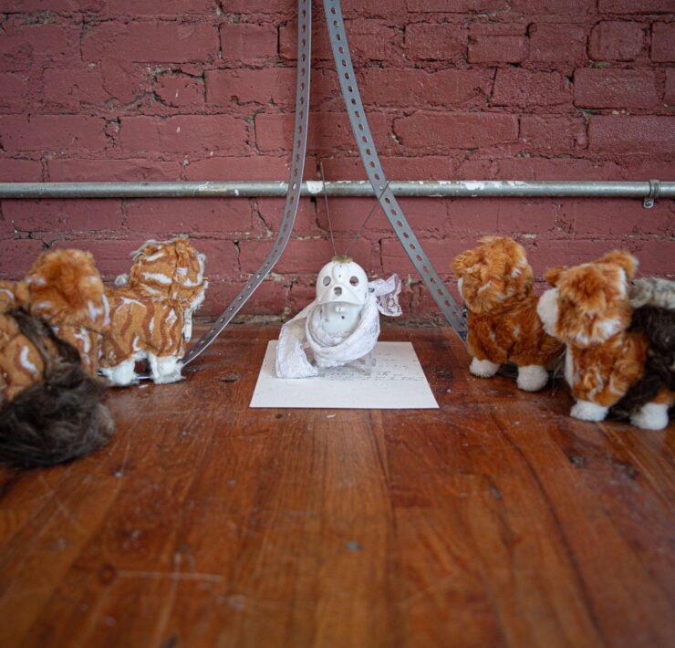 Taking position, the two dancers remain independent ensconced in different cavities of space. With heavy breathing, it starts with the rise and fall of the breath. Despite breath being an originating measurement of synchronicity and duration within the field of dance, these are recorded and layered sonic landscapes. James Lo, the composer for this score, builds an admittedly highly narrative opening number filled with ambient sonic inclusions that give ever more details for performers and listeners alike to imagine their sources. As a bee buzzes and phone rings the audience exchanges sharp glances trying to locate where in the room these instrusions are arising, which fuses the realm of the score and living moment of bodies in motion in the space into a singular inseparable animate plane. Lo collaborated directly with choreographer Melnick during a residency to build out this soundscape which is their second project working together over the years. Melnick appreciates “his complex way of working” as his scores” are almost transportive to [her]. It is like having a whole other body in the space.” Throughout the week leading up to the inaugural performance, Melnick and Mearns in the studio solidified their creative dialogue with Orving’s installation, as well as pairing it with Lo’s original sonic repertoire in the day before their first performance.