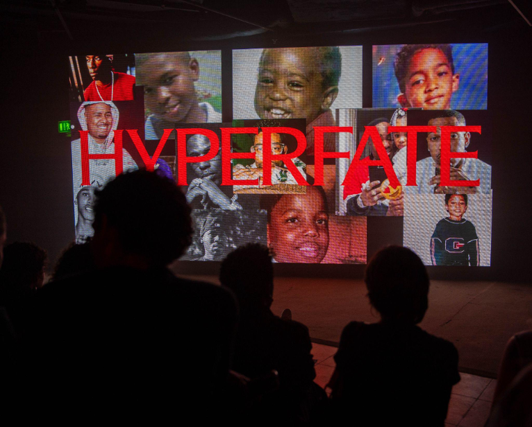 Oyiri’s installation comprises two video works Hyperfate (2022) and Hauntology of an OG (2025), both of which interrogate ideas of destiny, spirituality, and the cultural consumption of Black identity. Hyperfate compiles visual artifacts that reflect on society’s fixation with celebrity, grief, and martyrdom, centering on rappers such as Pop Smoke, Tupac, and Nipsey Hussle. Their shared trajectories and untimely deaths underscore a recurring narrative of loss, prompting Oyiri’s thought-provoking question: “Did these stars already know their fate?”