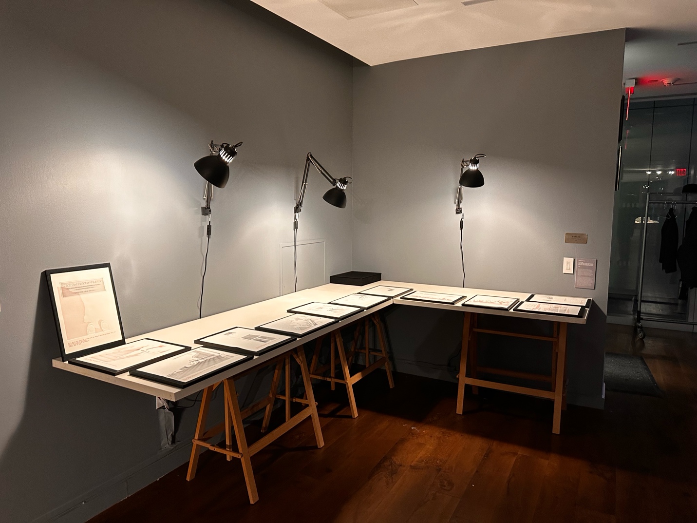The show opens with Priyanka D’Souza’s Call in Sick (2025), which uses found photographs of protests on the UC Berkeley campus in the 1960s. In this work, installed on two adjoining tables lit by lamps, D’Souza traces the participants’ contours and uses a machine to create phantom embossments as a base for sparsely illustrated recreations of these photos on archival paper. In these illustrations, blankets, human bodies, clothing, and handwritten signs almost disappear into negative space, close to being indistinguishable from the backgrounds. The curators indicate via the caption that the work brings into view those often left out of heroic protest stories, that is, the ill and disabled who cannot walk or stand in solidarity with the cause. I agree, and the subtle negation of people’s presence in the images also makes me think about how present and visible I have been at public demonstrations and what difference my presence might have made.