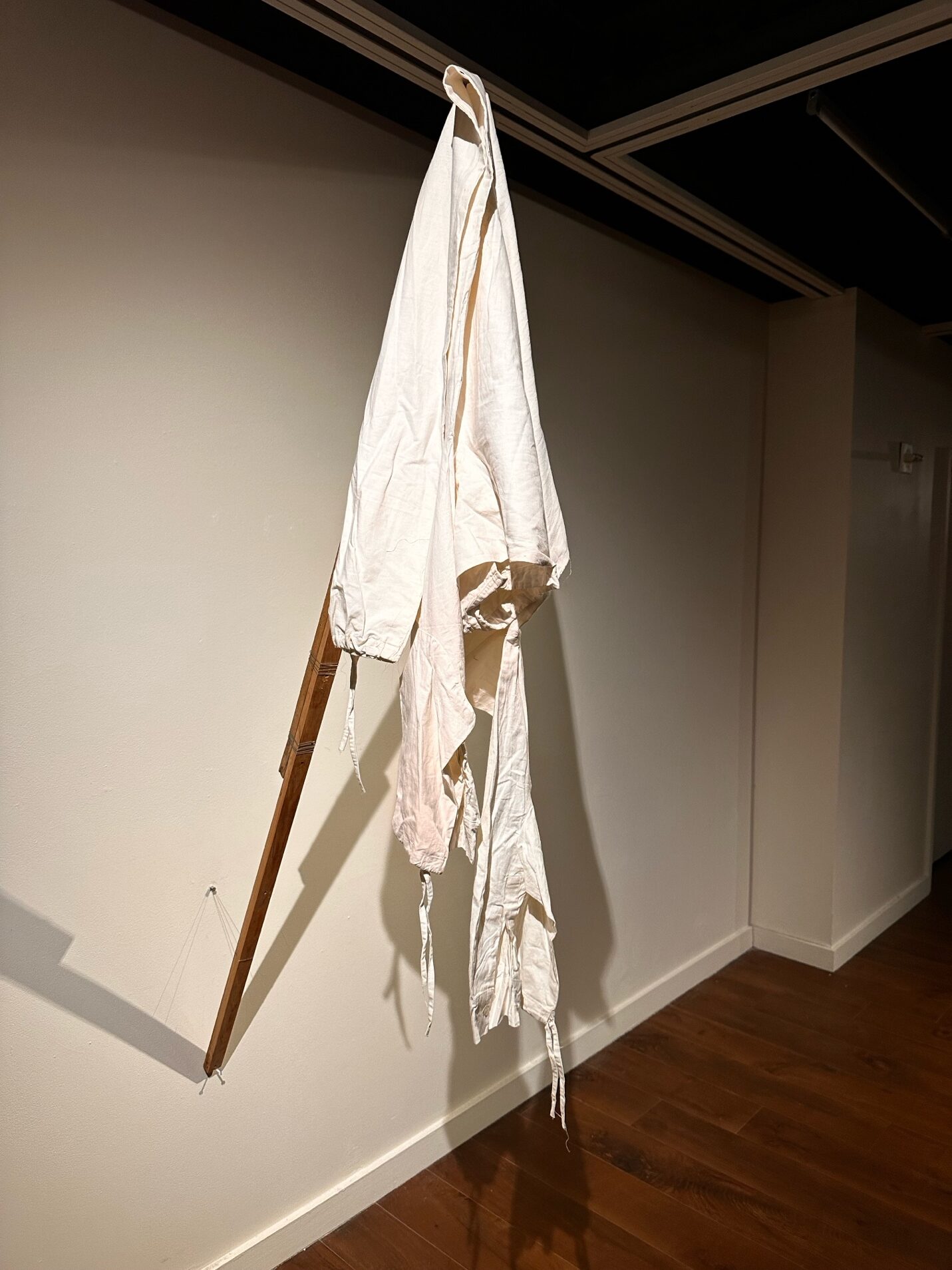 The lack of a public acknowledgment of atrocities, particularly those carried out by political insurgencies impel people to develop their own rituals and ceremonies around the disappearance of loved ones, for example, Shilpa Gupta’s Untitled (Wives of the Disappeared) (2006). It is minimal in composition, consisting of only two wooden rods wrapped together with wire to form an ad hoc flagpole with white garments draped over the end. The fragility of the body is made apparent precisely in its omission.