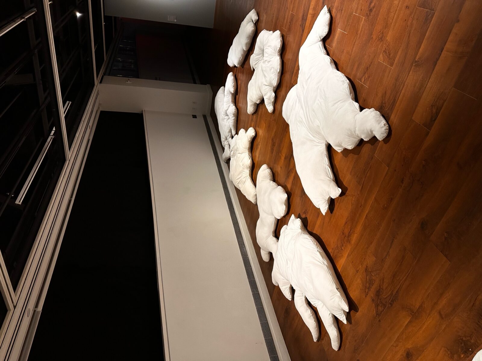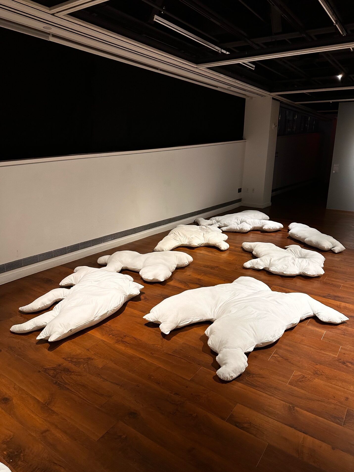 Lastly, Swati Kumari’s Beside Your Warmth (2025) makes the suggestion that substitution is also always a way of pointing to the lack of human presence and a tactic for making accommodations for this lack. Kumari has stitched together pillowy white cushions in the shapes of the traced outlines of the resting bodies of her mother and her grandmother and lain them on the ground.