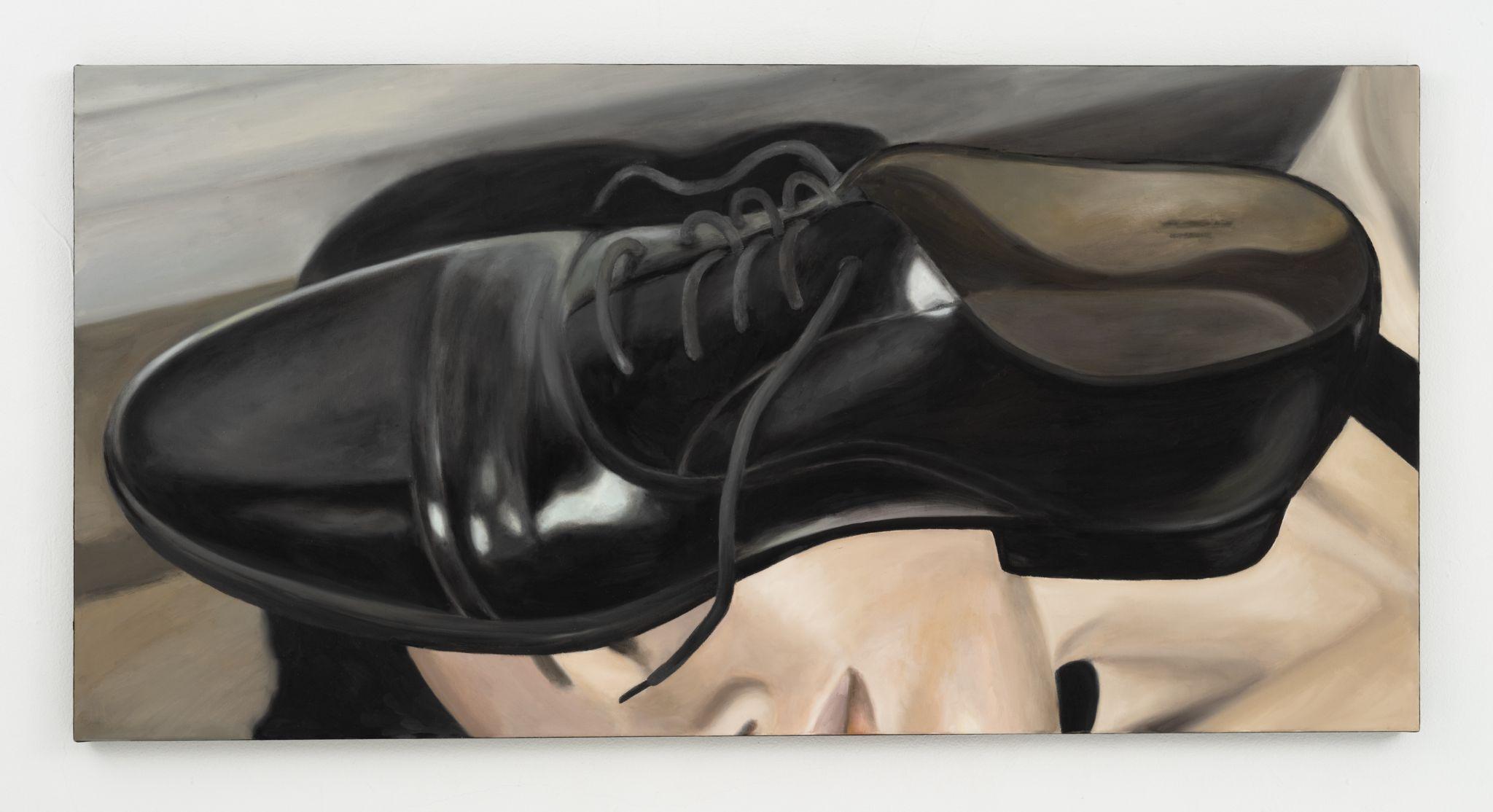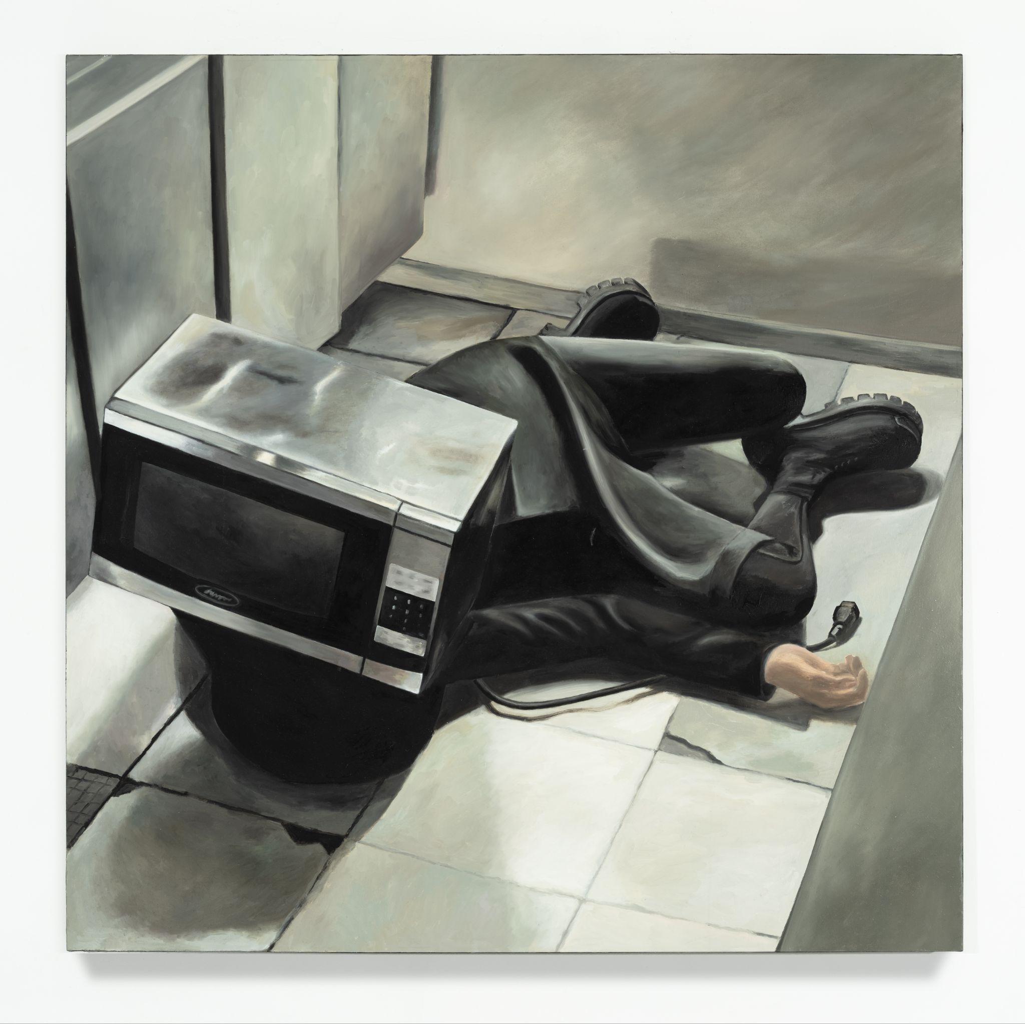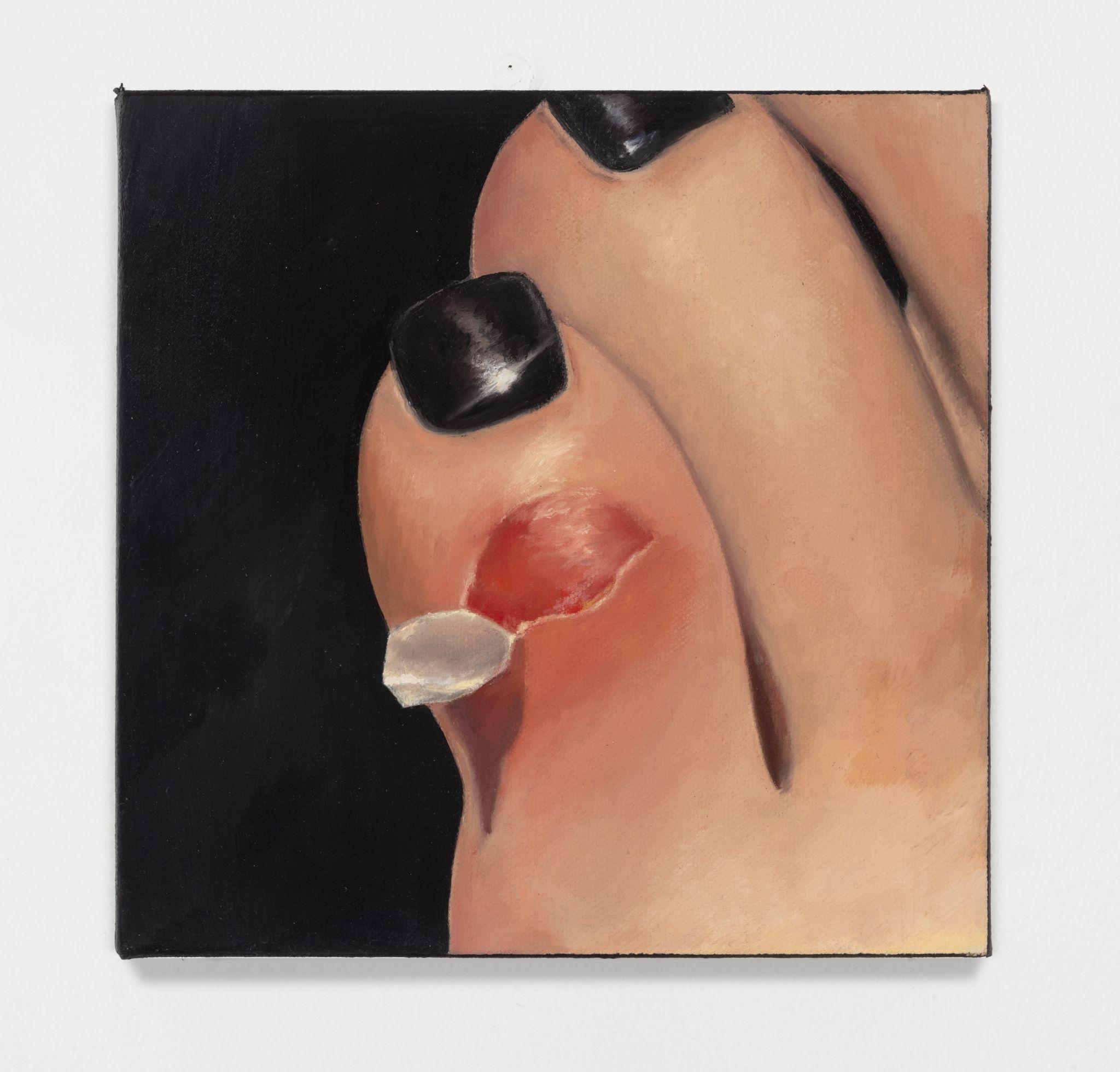 No faces are shown in full. Either cut off by framing or obscured by objects. Figures are often oppressed by objects. Chair, microwaves, shoes. It’s almost an exercise in forniphilia. As if in their submission, they’ve been relegated to a fixture of the floor. You’re the spectator to someone else’s interior world and all the specifics that that entails. The sensation is best exemplified on the small canvas “i look at the wound and see Moscow”. It depicts skin peeling from a little toe. An intimate image of discomfort, hanging flesh. With the name, you’re aware of the eye viewing it, what the toes owner is experiencing. Stinging sensitivity, raw to the touch.