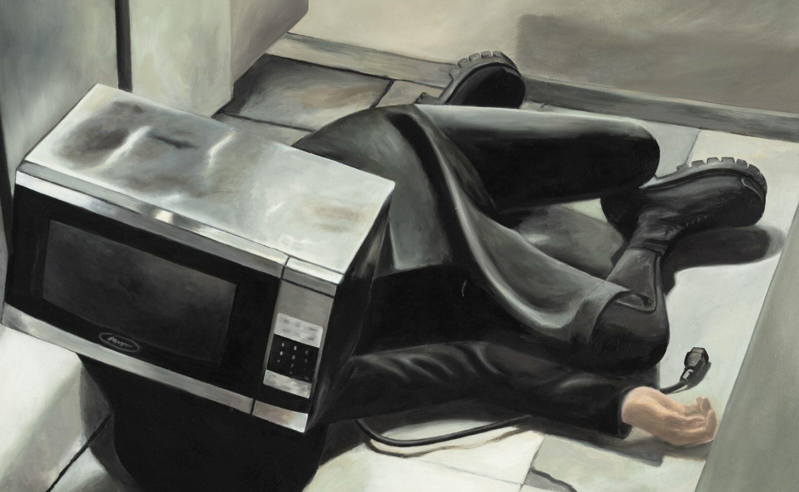 No faces are shown in full. Either cut off by framing or obscured by objects. Figures are often oppressed by objects. Chair, microwaves, shoes. It’s almost an exercise in forniphilia. As if in their submission, they’ve been relegated to a fixture of the floor. You’re the spectator to someone else’s interior world and all the specifics that that entails. The sensation is best exemplified on the small canvas “i look at the wound and see Moscow”. It depicts skin peeling from a little toe. An intimate image of discomfort, hanging flesh. With the name, you’re aware of the eye viewing it, what the toes owner is experiencing. Stinging sensitivity, raw to the touch.