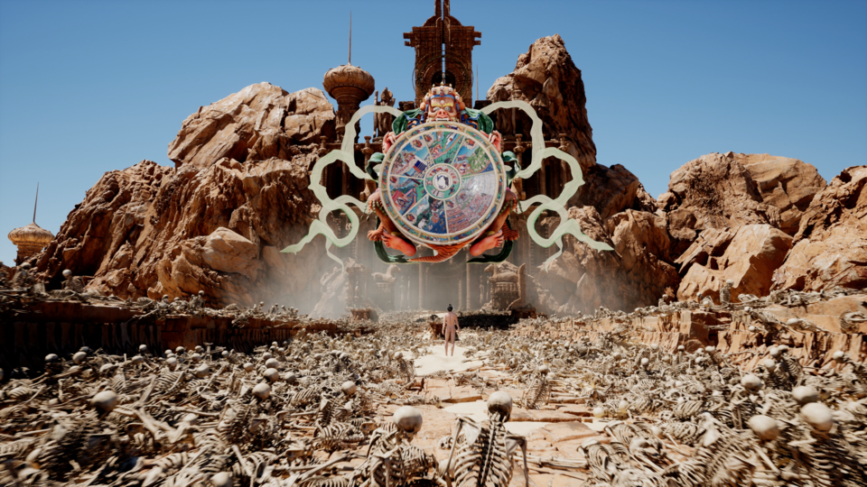 In Eastern traditions, identity is shaped by environments rather than fixed to an inner essence; Japanese audiences, for instance, may connect to a character’s outward traits without demanding identification with their journey, unlike the U.S. insistence on relatability. The Creator suggests that an artist’s identity can be fluid or bypassed entirely, that everything may manifest digitally, worlds growing beyond truth or self. The result is less a window into an artist’s psyche than an immersion into Lu’s world, where creation itself is problematized by its entanglement with technology, economy, and philosophy—and, perhaps, the delusions of grandeur that the process of any kind of worldbuilding brings forth. Towards the end, staging Buddhist cosmology—the Wheel of Life, the Six Realms, and affective states such as greed, hate, and jealousy—as game-like digital environments, Lu at once expands the terrain of artistic practice into a speculative reflection on creation itself, but also draws back to his own spiritual practice.