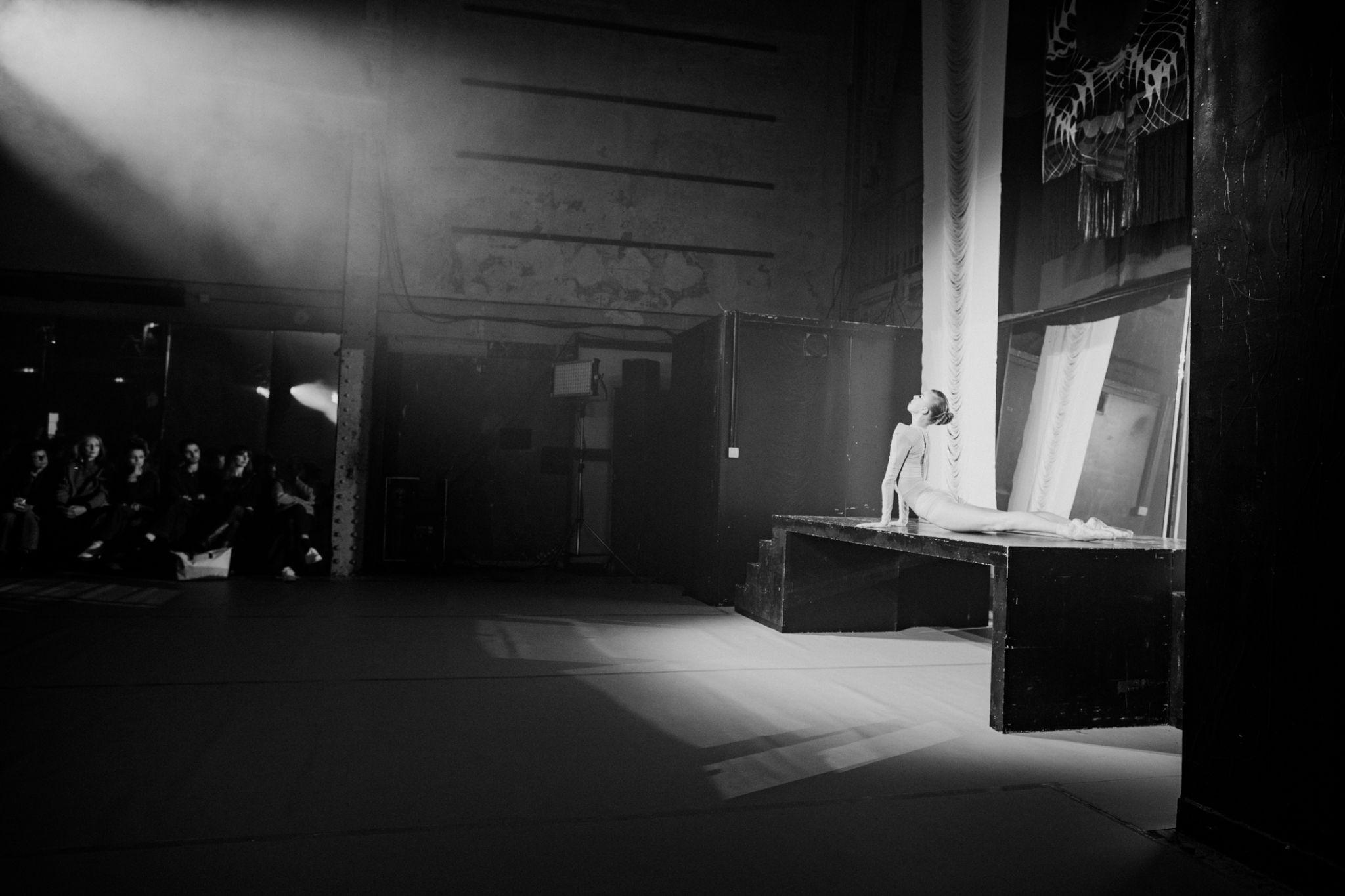 With subtle use of the lights, the set design reshaped the Consulat’s industrial space—high ceiling and steel structure—into an intimate space. Welcomed by a trumpet player, guests were soon projected into the atmosphere of a personal and minimalistic version of a contemporary cabaret led by Freeman and choreographed by Manon Dubourdeaux. Freeman’s first appearance and inaugural solo convey her background in classical ballet. The result of hours of practicing, facing the mirror, and an obsession with mastering technique (also inherited from years of gymnastics at a national level) is an undisputable virtuosity, full and impressive bodily control. Balancing from a graceful pas de deux to energetic moments of collective dancing, bodies start to meet and loosen up, neo-ballet faces contemporary dance, jazz music leaves room to baile funk, hyperpop, and more electronic compositions.