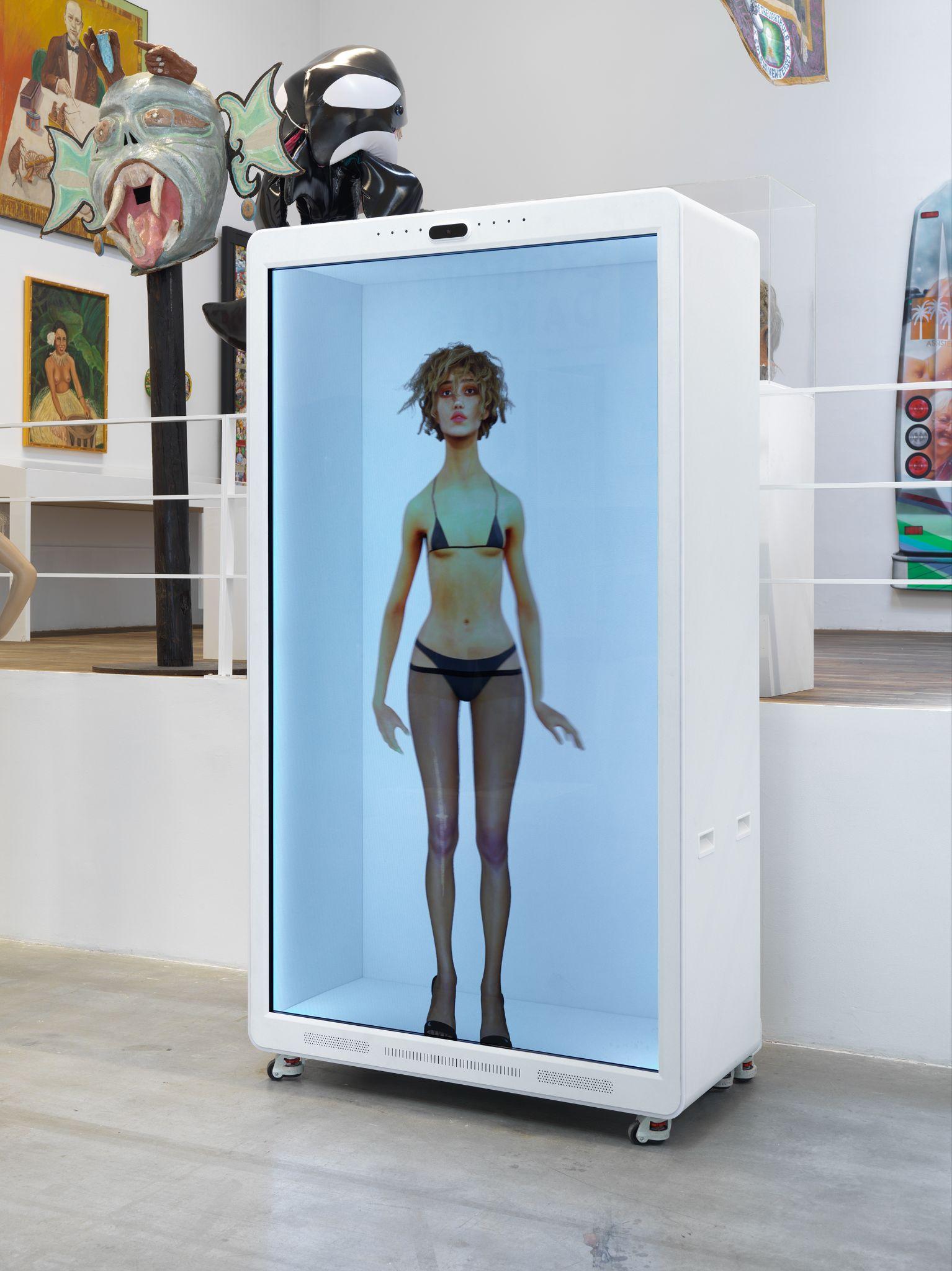 One of the most engaging works of art in the exhibit is Nadia Lee Cohen’s Entitled (2025). An exclusive edition, just one of two, Entitled is inspired by the frustrating amount of care required to preserve digital pets like Tamagotchi, reminiscent of Cohen’s upbringing in the Millennial age. Replicating this digital concept is Cohen herself, posing as an inverted model with a strictly limited lifespan, prompting viewers to get close and connect with her avatar before its health wears off. However, we quickly learn that here femininity is a mirage and that a single touch to her abdomen leaves Cohen bruised, betrayed, and recoiling. Eventually, your touch will lead to her death, only to be rebirthed into the same inescapable cycle; a similar pattern to that of the double bind, where women are forever gridlocked between two sets of contradictory expectations as a result of generational, antithetical gender stereotypes.