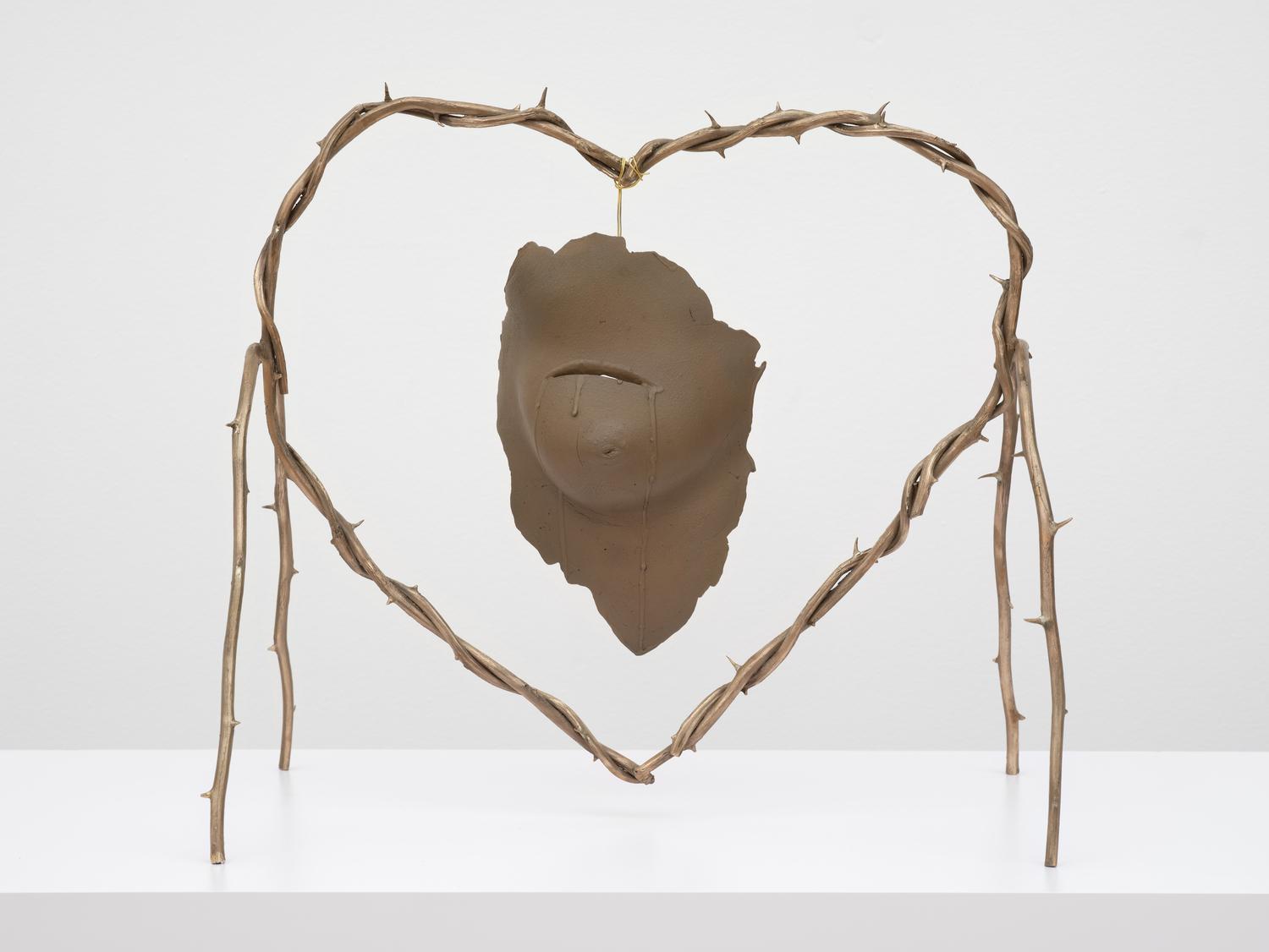 In Self-Portrait with Thorn Heart (2023-2025), another L.A. artist, Kelly Akashi reminds audiences that it’s not just societal expectations women juggle, but biological and physical sacrifices we make to survive. Made up of a mold of her own breast Akashi took in 2023, and latterly marked an incision upon in the very same place her surgeon did as part of her cancer treatment, Self-Portrait with Thorn Heart serves as a symbol of both suffering and survival—with the title referencing Frida Kahlo’s Self Portrait with Thorn Necklace and Hummingbird (1940), both of which share compelling arguments of pain and resistance.