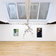 Reminiscing about my childhood is bittersweet. Sweet because I remember how carefree and innocent I was, bitter because I know I’ll never return to that; even if you’re able to revisit once-beloved places from your childhood, you’re struck with how small and dilapidated everything has become in comparison to the idealized memories in your head. Soo Park’s P.D.B (Play Donkey Back) captures this phenomenon, depicting a small playground with cutesy animal figures whose vivid paint coats have now begun to rust. A few steps away, Down to The Hole is a resin sculpture of a manhole cover aping the evolution of man, except it’s now the evolution from a cockroach into Bella Boo. Upon closer inspection, one of the holes displays a video of animated food (burgers, ice cream floats, and a shovel?) disappearing into the depths of the sewer. Perhaps these are offerings to another cockroach who secretly harbors dreams of debuting as an idol like Bella Boo.