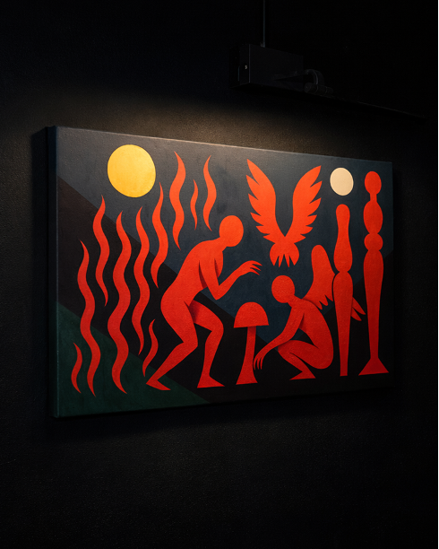 In the ambiguity of these forms, which seem to emerge and dissolve at the same time, an unstable, almost oneiric drift appears, one that could faintly evoke Salvador Dalí or Ad Minoliti, though never fully surrendering to the image. In this sense, the work displaces any stable reading and reinforces, through its very location within the gallery, the idea of an experience that resists immediacy.