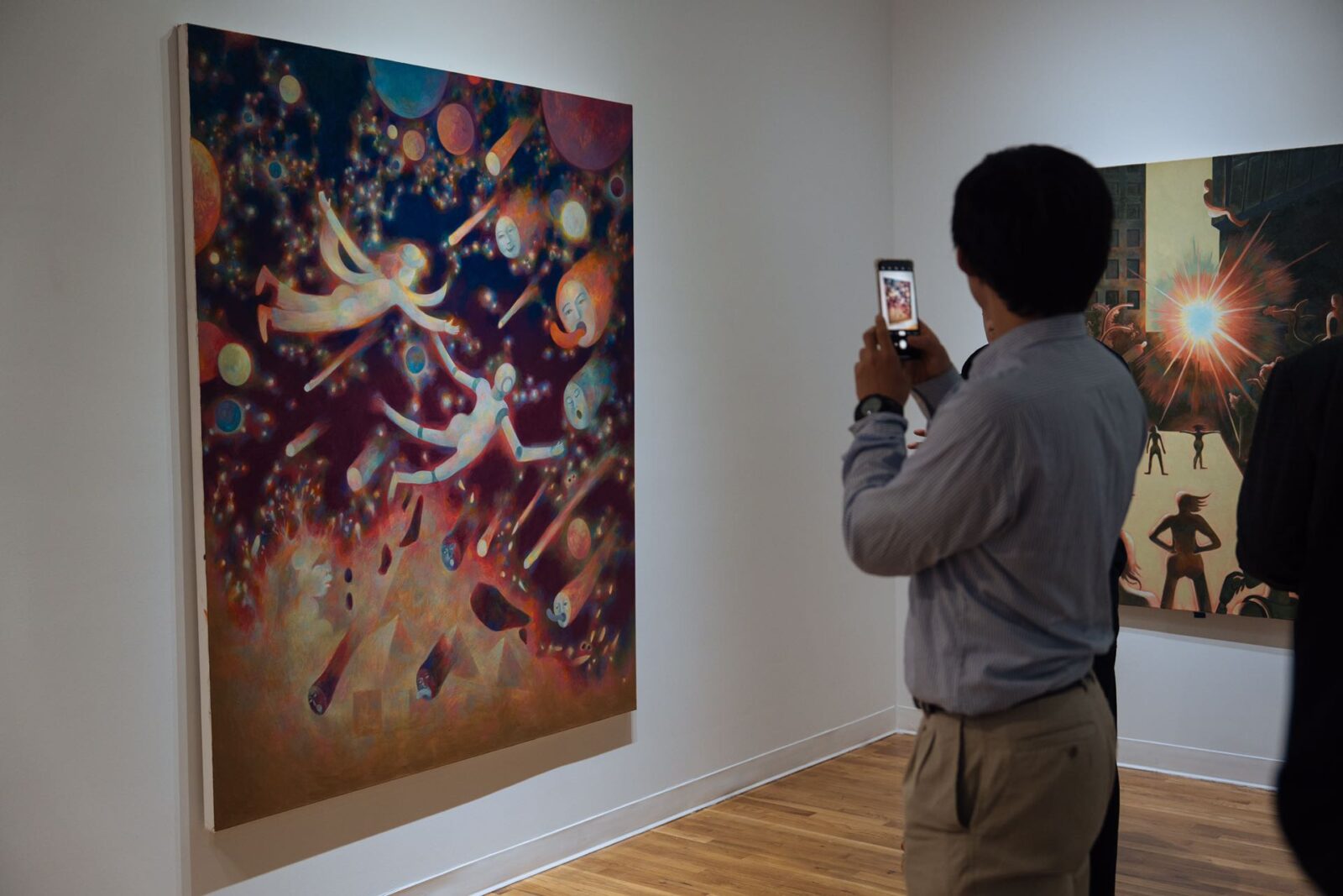At first glance, the works seem to be menacing, jarring—simply because that is what I would expect from this type of large-scale surrealist work. Wrong. The tone is positive. An astronaut holds hands with an angel, dodging asteroids. A couple runs down a country road, unlike in American Gothic, they are agile, hair flowing in the wind. Perhaps they are being chased by the figures behind them, but I think they will be OK. Bursts of light appear in several pictures and figures with their hands lifted or looking upward. It is as if Xinyu has collected collective fears and anxieties of techno-society and computed them into friendlier scenes. Not too friendly mind you, they must be believable.