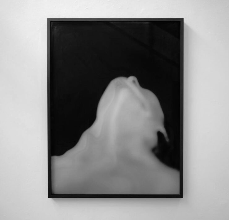 Finnish artist Tiina Pyykkinen has on a piece of stainless steel painted layer upon layer of oil in Sweet Dreams (2023); sleek, but overladen. Layers of anxiety that appears as one of the surface, perhaps. Connor Sen Warnick, in his video work “Fainting,” recreates a feeling of losing control through a series of disorienting images. It references Ringu (1998), the Japanese horror film, where a reporter realizes that watching a woman’s spirit captured within a videotape leads to death, so she attempts to solve the curse and cheat death. While the sea witch Ursula in Disney’s The Little Mermaid (1989) attempts to trick her way to the sea throne, but ultimately dies, becoming sea foam. In a glass aquarium, Phoebus Osborne recreates the aftermath of Ursula’s death, we see the remnants of a material body after a chemical process with rust and copper sulfate staining the walls of the aquarium. Moving away from the “jumpscare aspects” of the film, for Warnick, fainting is a death we wake from, or like in Ringu, climb out from ith cunning, for Osborne, death is a transformation of our bodies.
