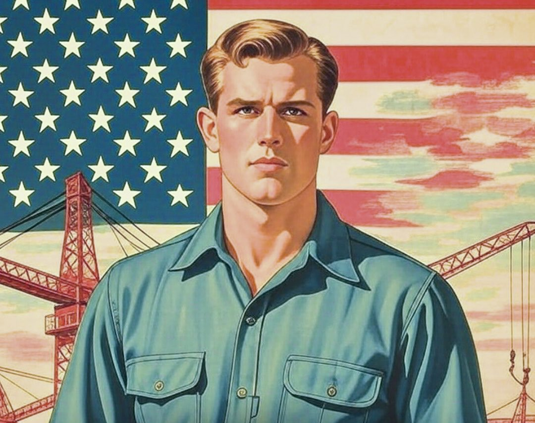 When the Labor Department posted likely AI-generated images of White strapping young men posing in front of job sites as part of a social media campaign in September and October, art historians and everyday Americans were quick to point out their similarities to Soviet, Chinese, and German propaganda art. What has been less covered is that at the heart of these images is a pointed homoeroticism that conflicts with far-right Christian nationalism’s attempts to deny the personhood of queer and trans people. In co-opting this content, the deeply queerphobic Trump administration fails to recall how their glorification of White manhood very clearly veers into the homoerotic, especially because one of the main architects behind 20th-century masculinity used his own partner as his muse. Joseph C. Leyendecker lived with Charles Beach, who became his model, for nearly 50 years, to create iconic advertising and anti-Nazi propaganda that has come to shape U.S.-American masculinist imagery.